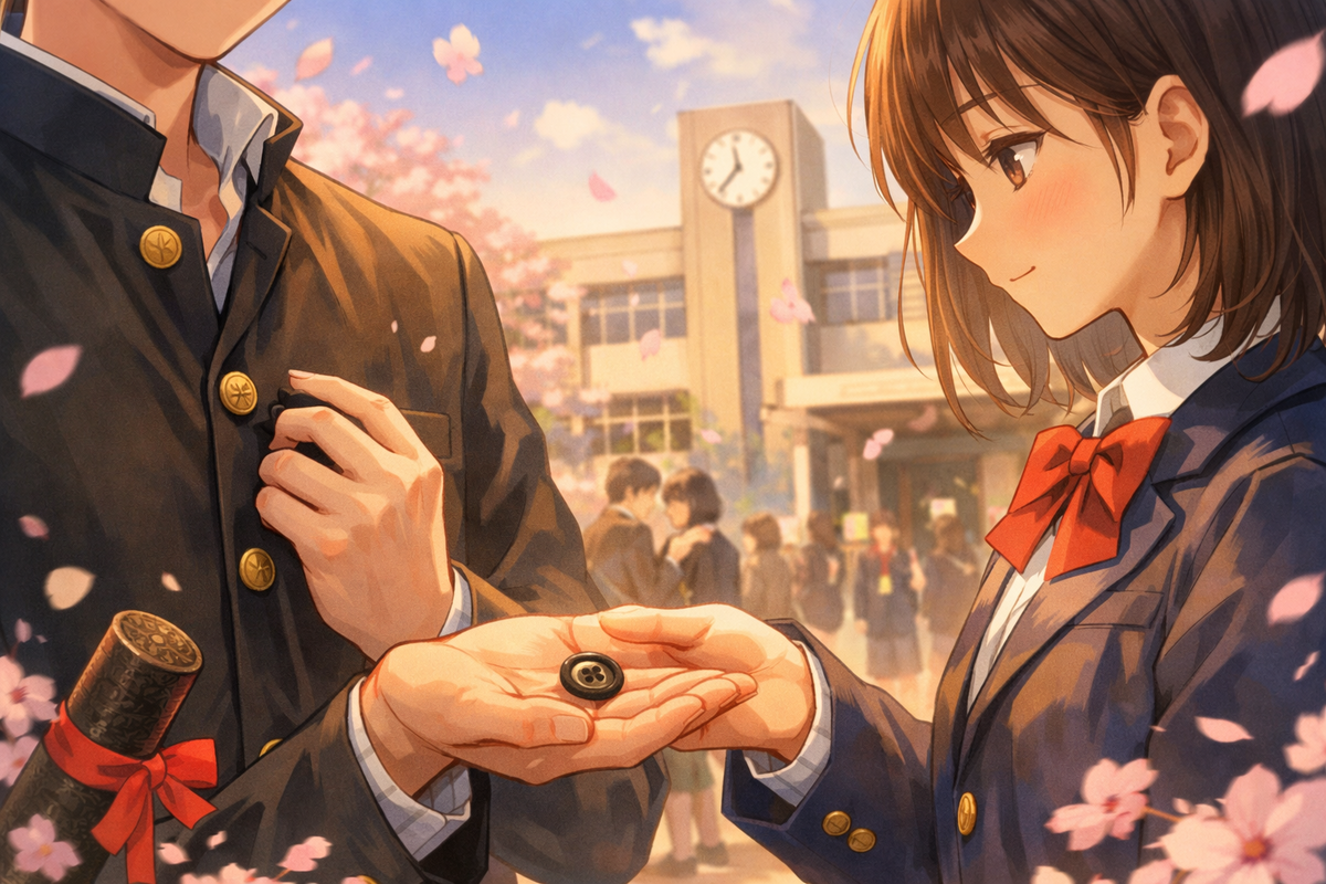 男子学生が想いを寄せる相手、あるいは後輩の女子に学ランの第2ボタンを渡す(または奪われる)という風習です。